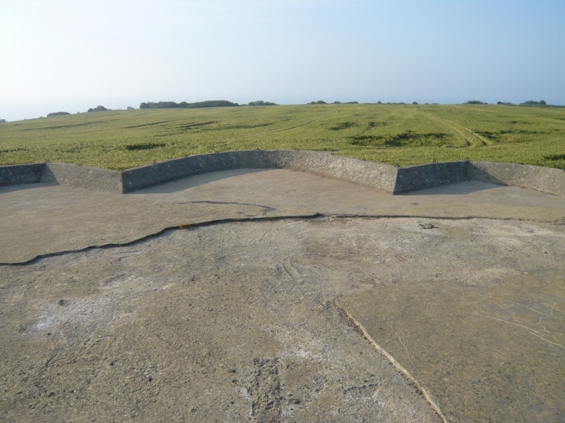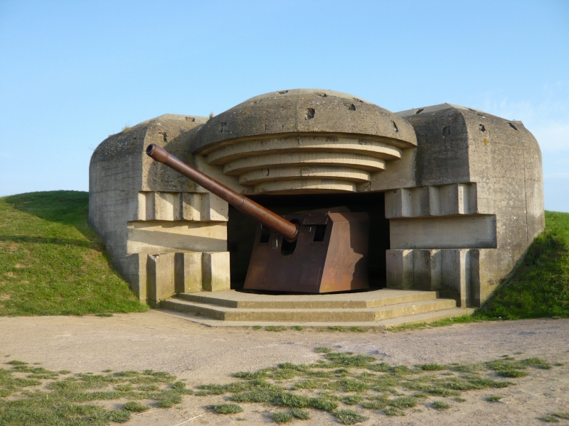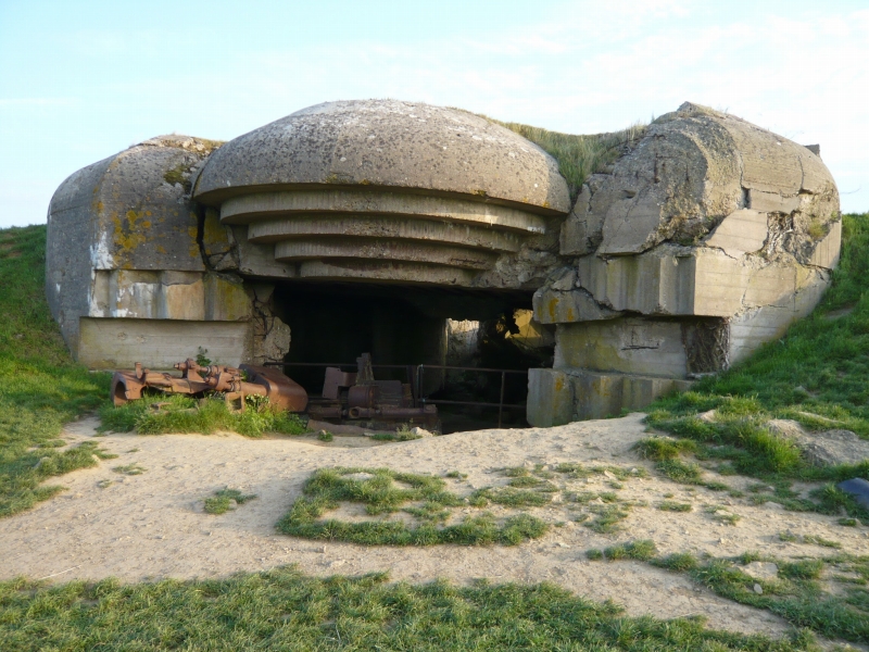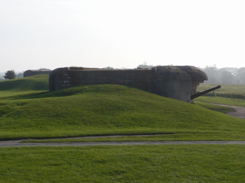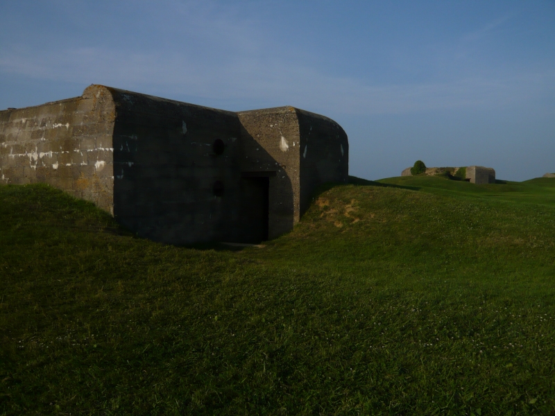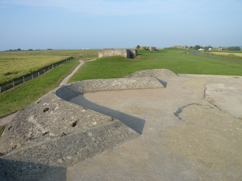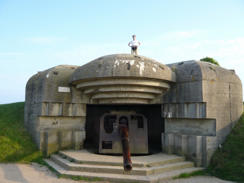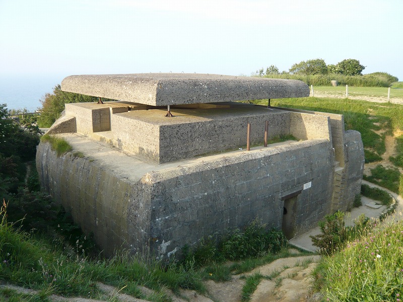 一つ目は大砲がなく、損傷もはげしい。 2つ目、砲身が下を向いている 3つ目、前の記事でも紹介した、砲身が上を向いていてもっとも保存状態がよい、バンカー 4つ目は保存状態はあまりよくなく、きちんと写真は撮っていませんでした。 「記事の中で砲台、バンカー、トーチカなどいろいろな呼び方で書いていますが、フランス語でBatterie 英語battery 意味は砲台, 要塞とあります。 またこのようなコンクリートに覆われた陣地はトーチカと言うのがわかりやすいと思いますが、トーチカはロシア語で、日本語で訳すと、特火点または掩蔽豪等、一般的でない難解な言葉になります。また英語のBUNKER(バンカー)は広い意味で使えますし、現地での英語表記についていることが多いので、バンカーという言葉も使っています。いろいろ使用して混乱するかと思いますが、御了承ください。」 砲台を横から見たところ うしろにまわってみる。出入り口がある。 上に登ってみた。 トーチカの上から、海のほうを臨む。 |