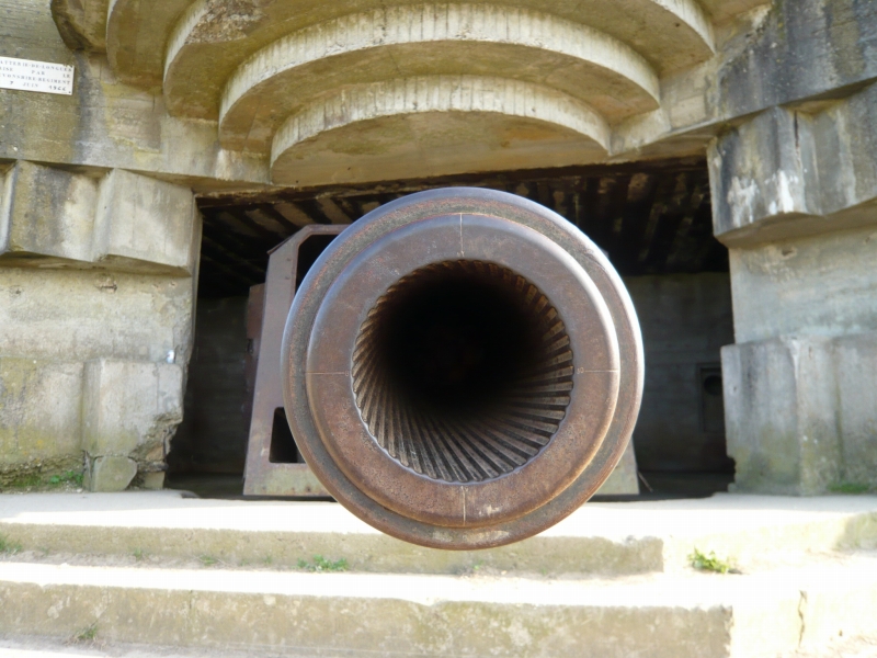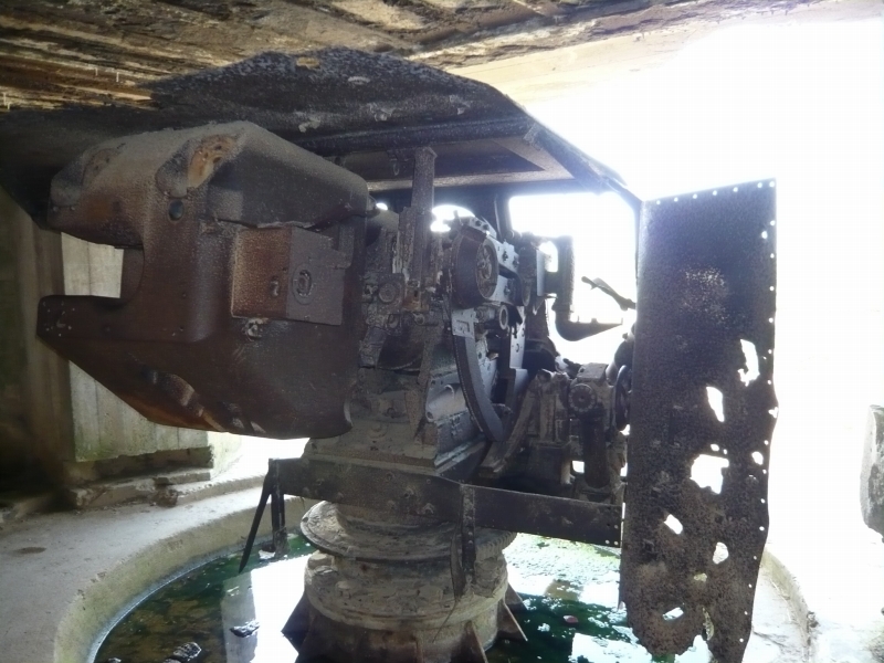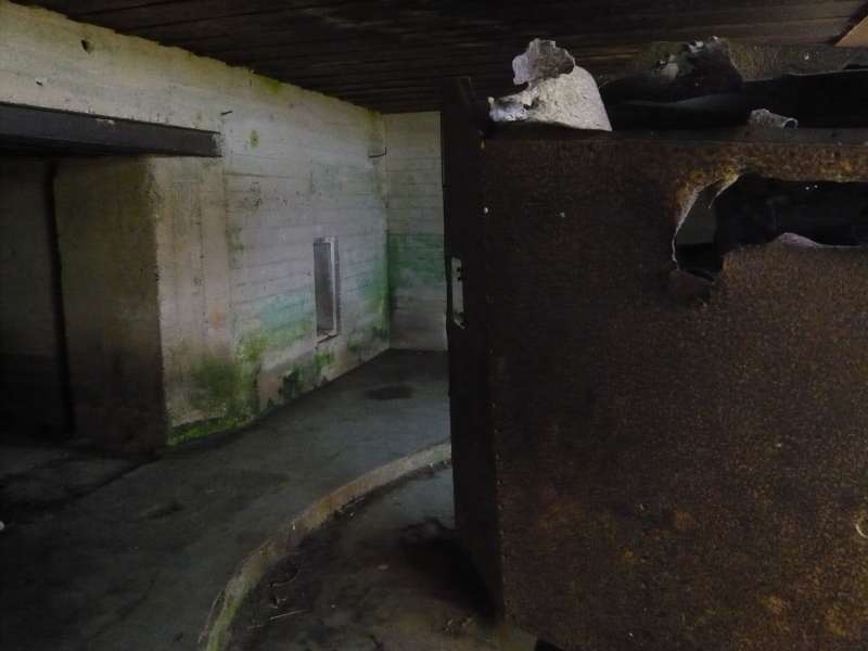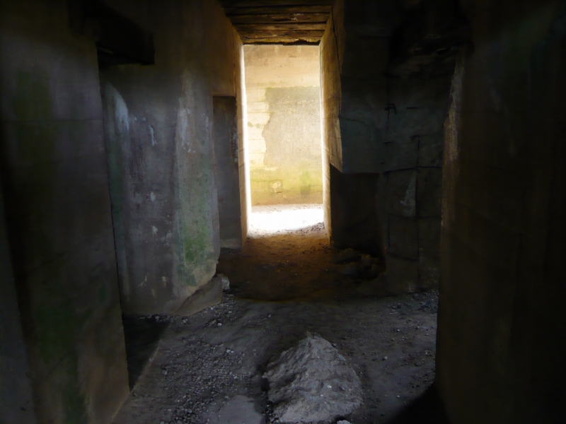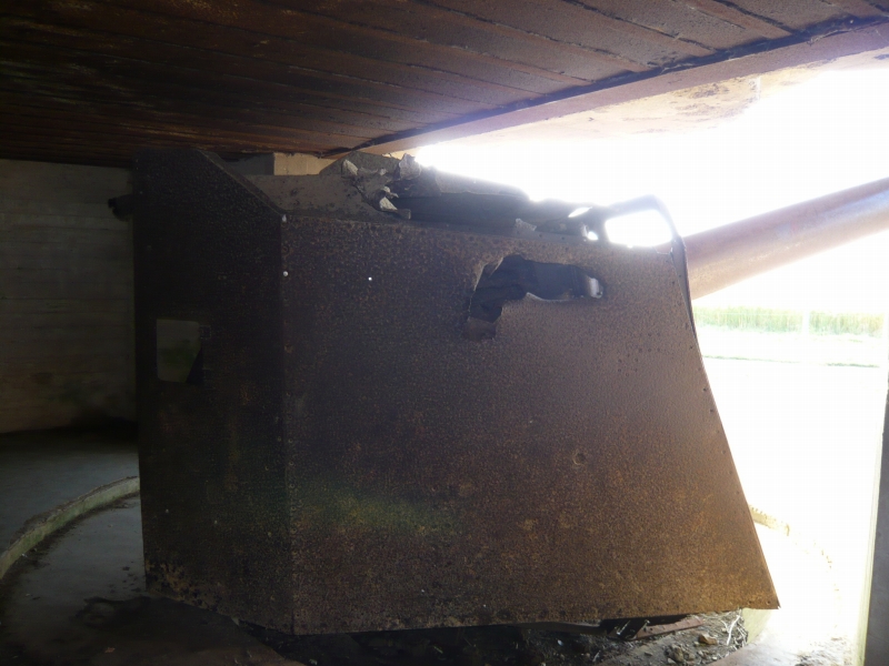 このトーチカは前面が開放されていて、特にコンクリートによる防御があまり施されていませんが、これは空爆による破壊を防ぐ為と、この大砲が、対陸上戦闘用ではなく、あくまで艦船を攻撃するために作られているからでしょう。この要塞が作られている場所は、海岸沿いの崖の上なので、ここに上陸することは想定していないはずです。実際の戦闘では、連合軍の艦船との撃ちあいで、3台の大砲が使用不能になったそうです。 大砲は鉄板で覆われています。 大砲の後ろ側には、いくつかの小部屋があります。 ノルマンディーでは、このように大砲ごと現存している要塞は、きわめてめずらしいそうです。